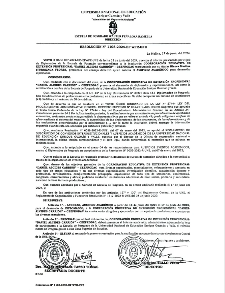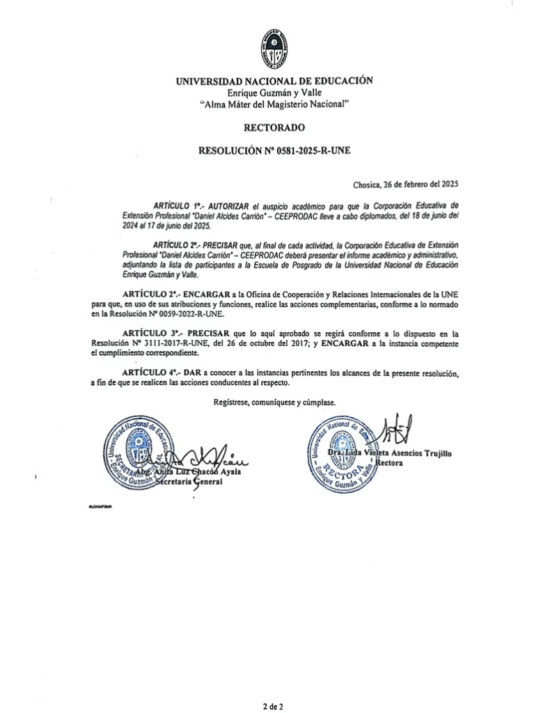 El Auspicio Académico de la Corporación Educativa de Extensión Profesional “Daniel Alcides Carrión” CEEPRODAC, con la Facultad de Ciencias Sociales y Humanidades de la Universidad Nacional de Educación Enrique Guzmán y Valle, a partir del 06 de febrero del 2024, hasta el 06 de febrero del 2025, para la realización de Especializaciones, Diplomados, Cursos de Capacitación, Cursos de